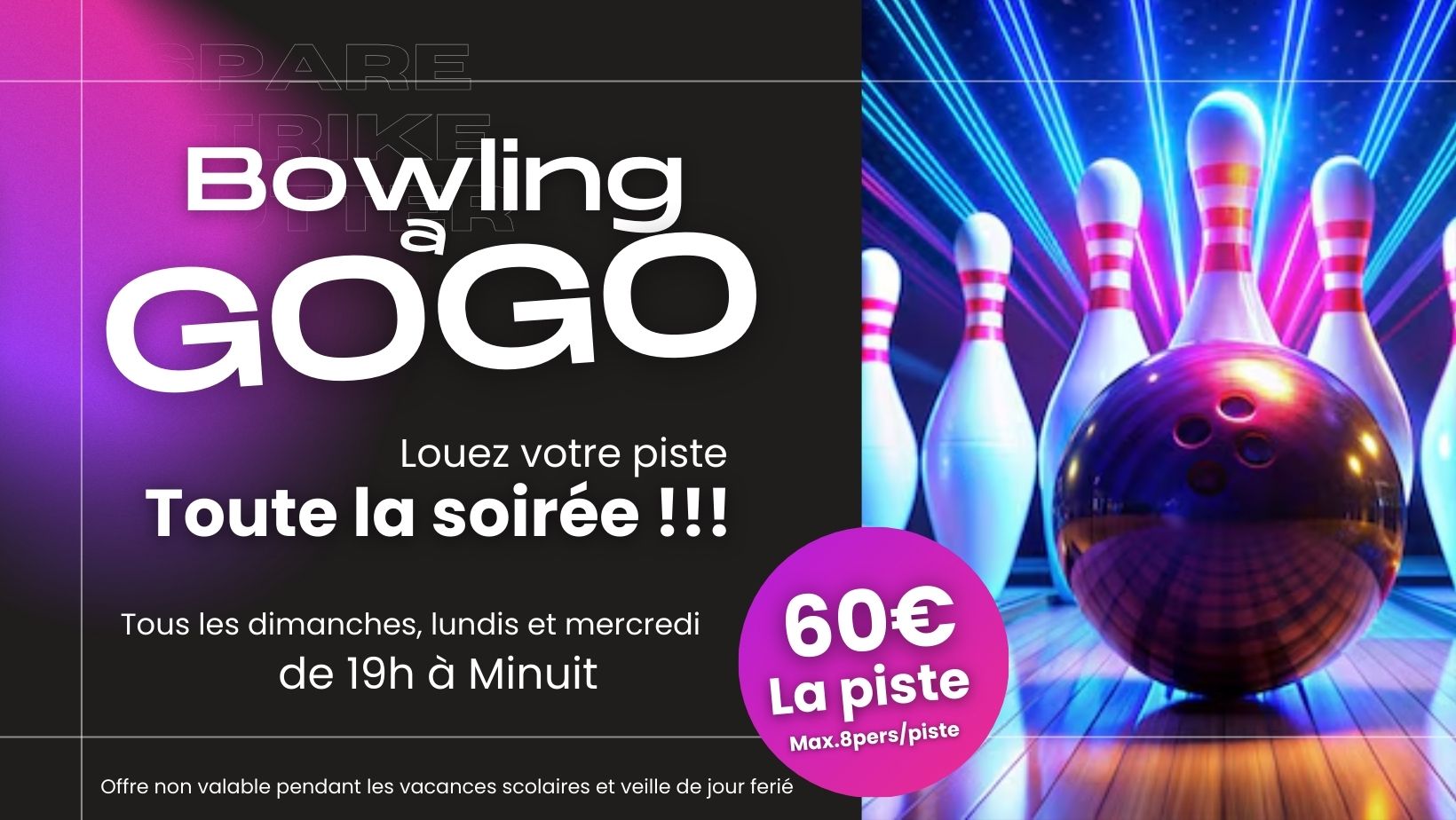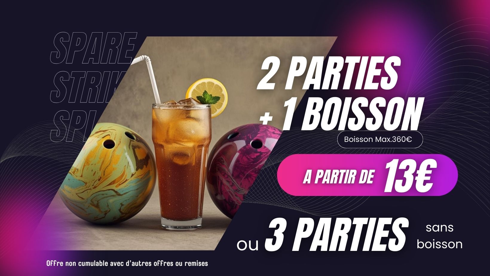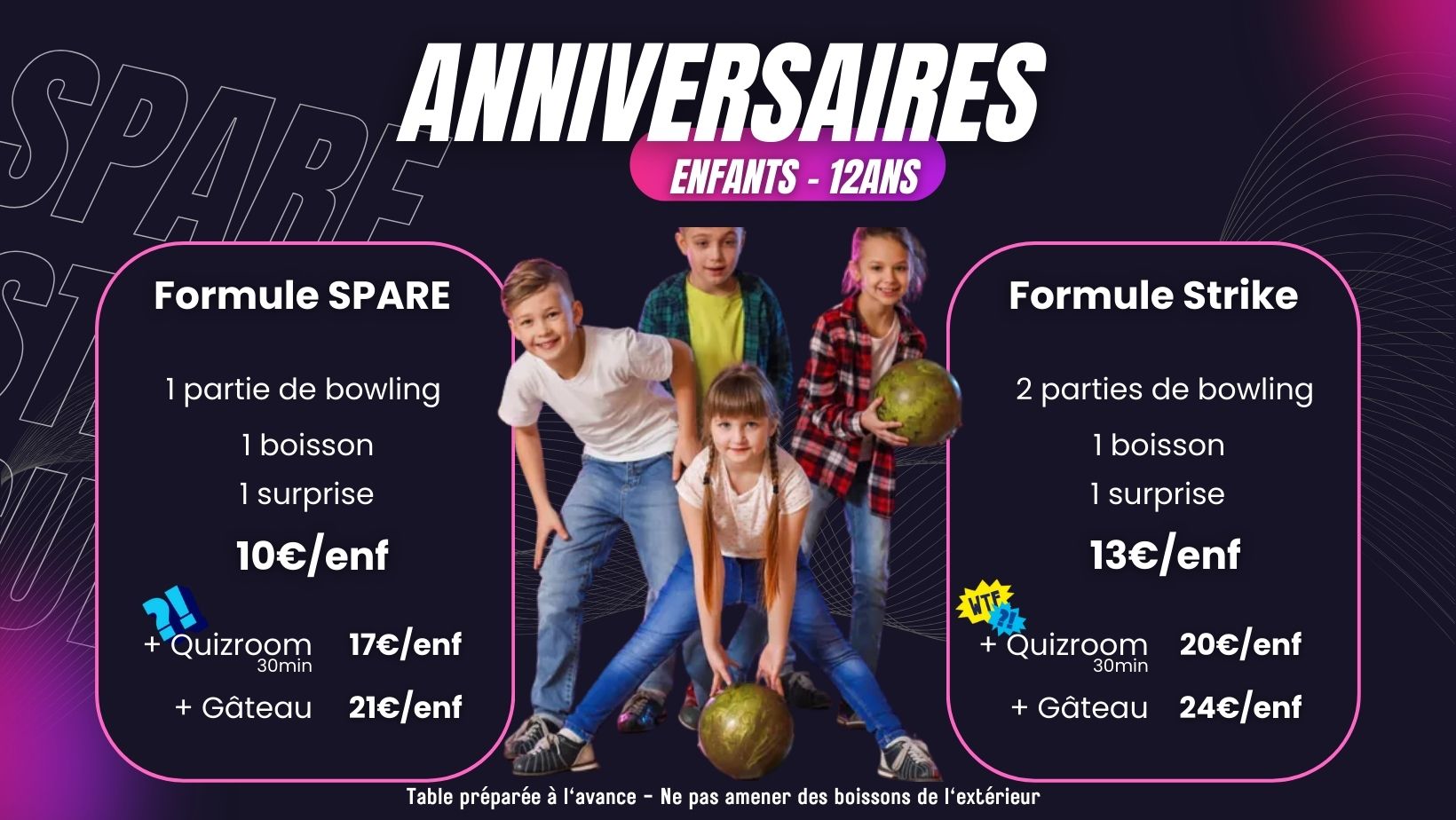 Toutes les occasions se transforment en un véritable plaisir, 7j/7 dès 10h, profitez de nos formules anniversaires ou nos formules festives en repas ou cocktail dînatoire, de nos soirées spéciales Bowling à Gogo ou soirées à thèmes.